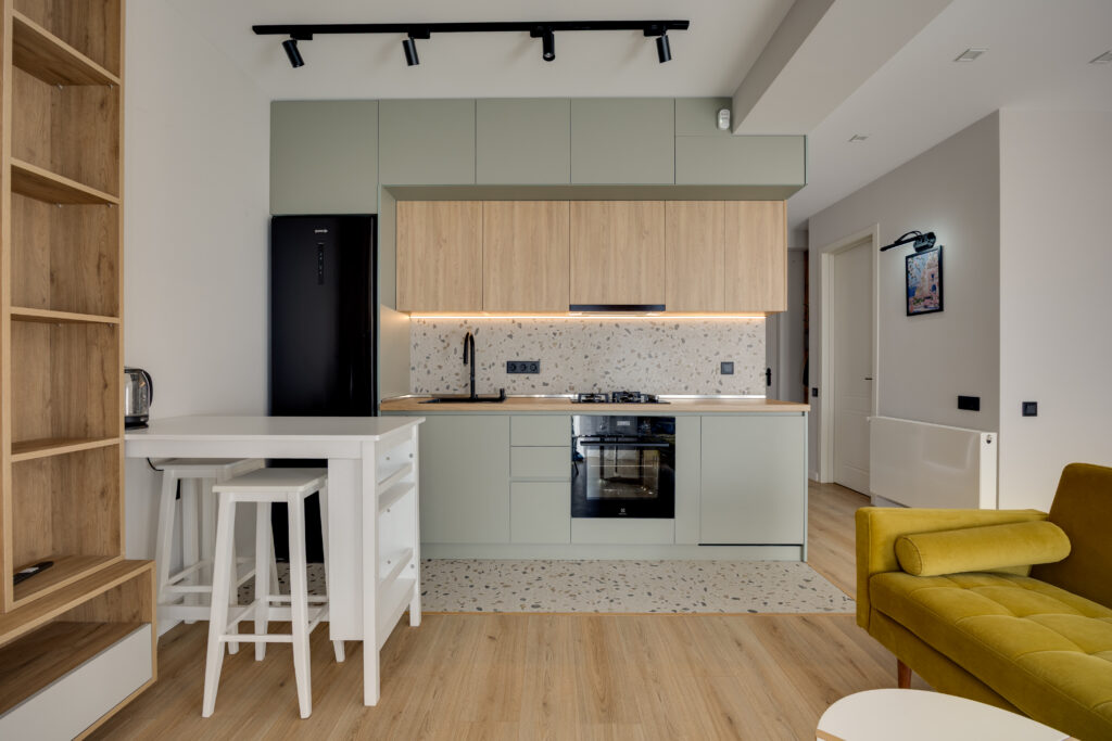 The apartment features a studio layout, so the kitchen and living area naturally flow into each other — the zones visually complement one another, making the space functional. The furniture colors were deliberately chosen to harmonize with the natural light streaming through the windows — throughout the day, the interior subtly shifts in tone, making […]