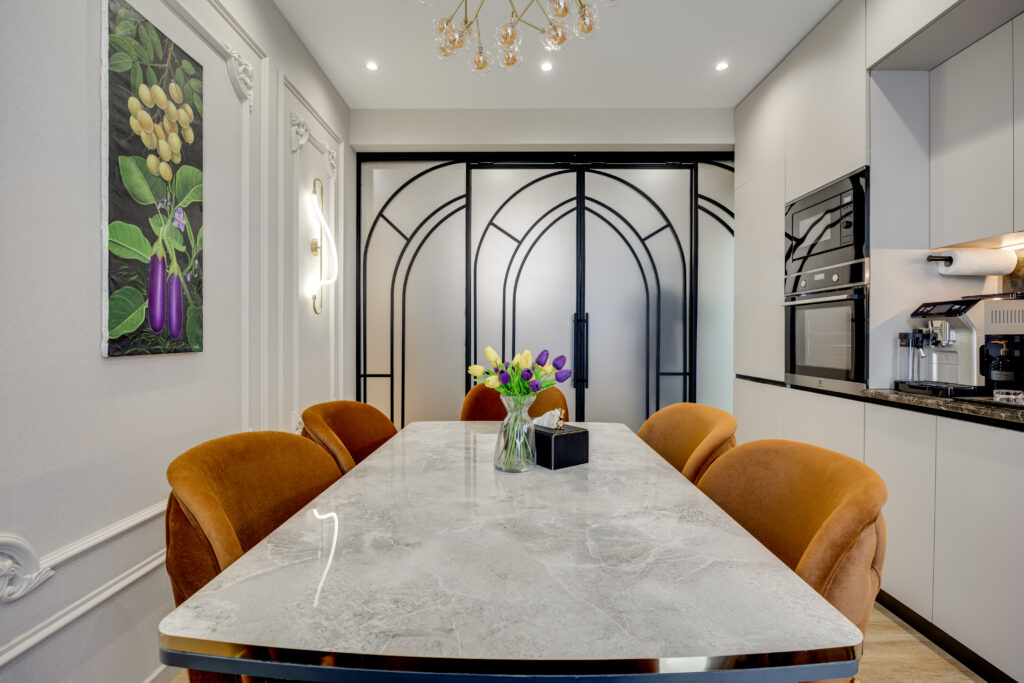 This apartment was designed in a modern and cozy style with light neutral colors and warm wood details. The living room features a comfortable sofa, TV wall with storage, and classic wall moldings that bring elegance and texture to the space. Practical solutions, like a built-in bar cabinet and soft lighting, make the apartment feel […]