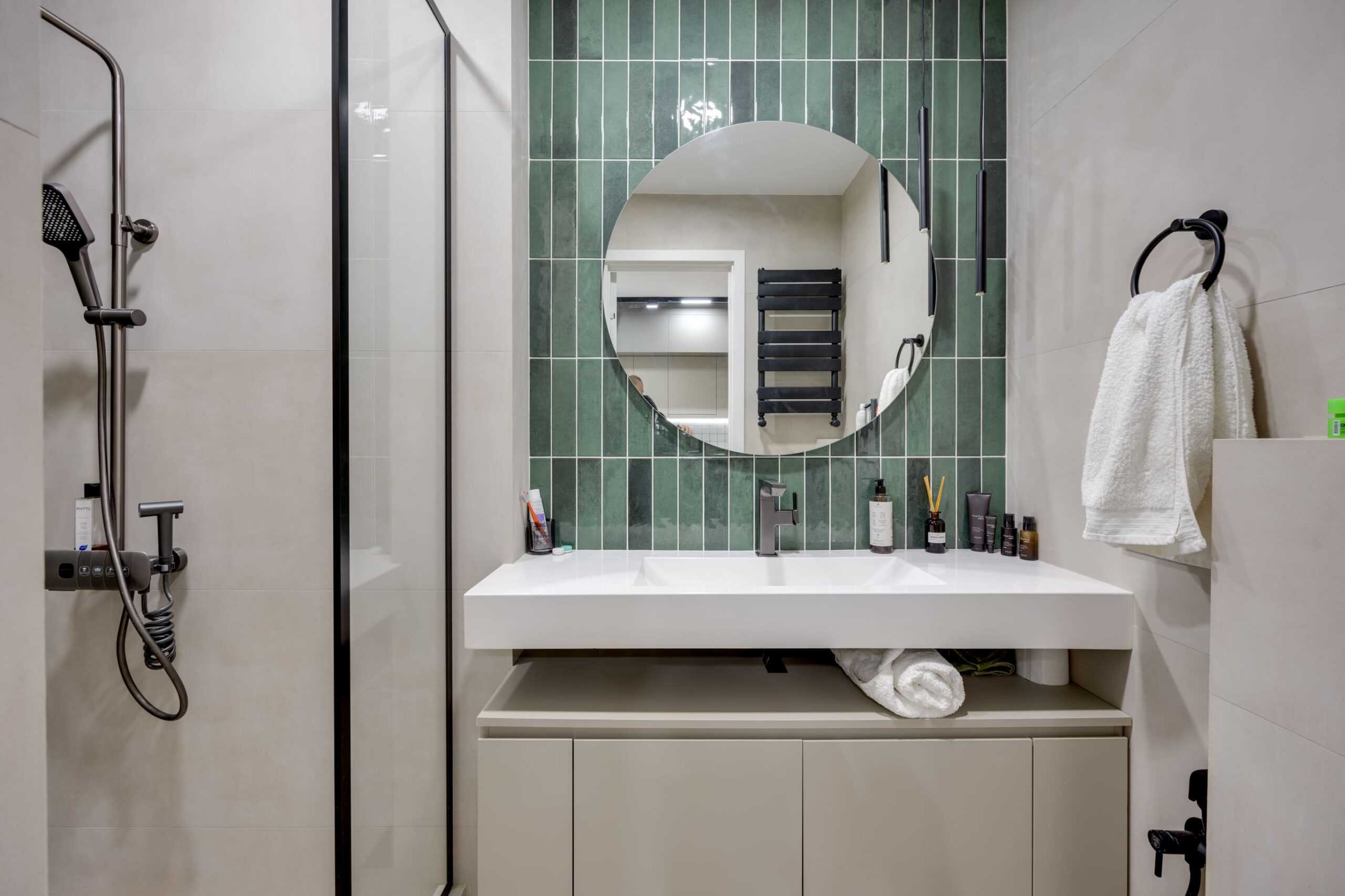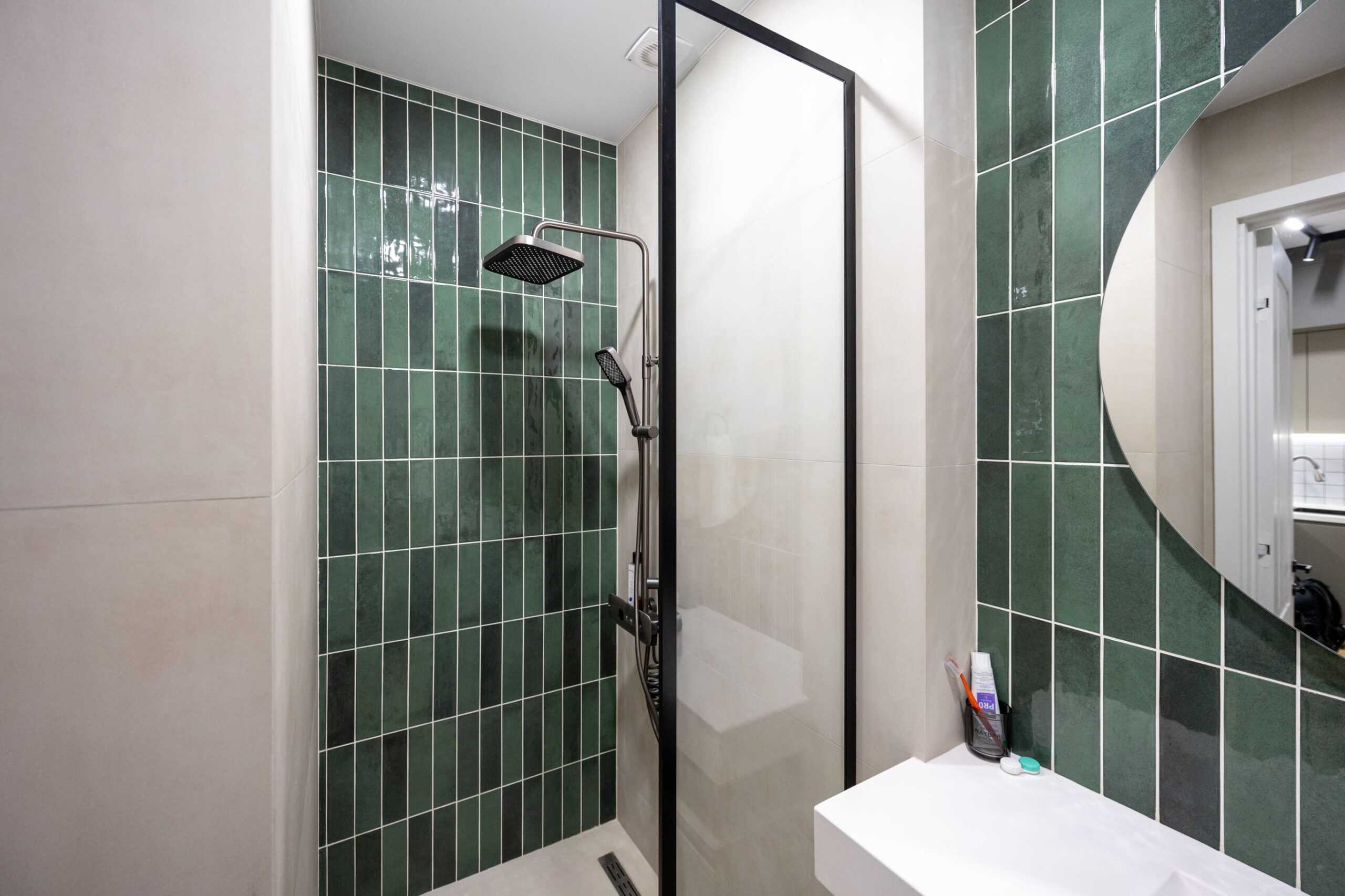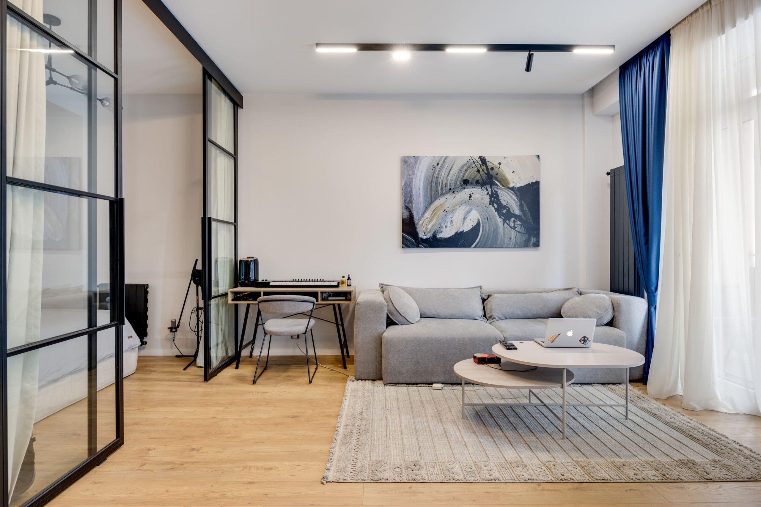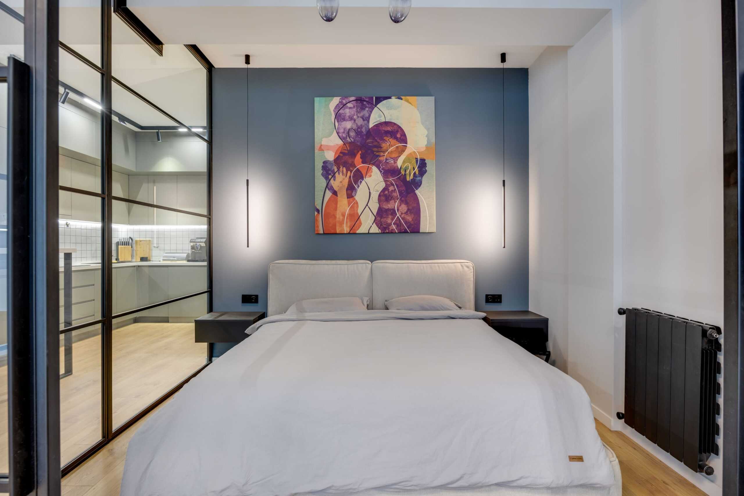 This space seamlessly merges modern design with practicality, creating a tranquil and inviting atmosphere. The bedroom creates a peaceful atmosphere, with a glass partition offering an ideal balance of openness and privacy, allowing the room to feel light and expansive. Every detail of this home has been thoughtfully designed to create a harmonious blend of modern style and comfort, where style and comfort coexist in perfect harmony.